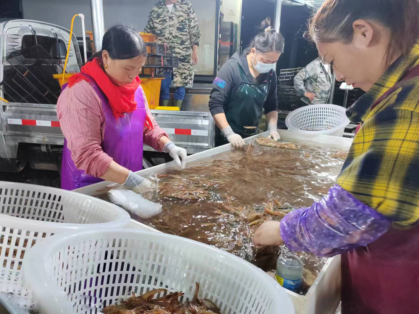 六月的初夏,灌東鹽場迎來了一年中第一波豐收季。在三圩養(yǎng)殖區(qū)的收購現(xiàn)場,忙碌的養(yǎng)殖戶將一筐又一筐的斑節(jié)蝦運(yùn)送到集中收購點(diǎn)。夜幕下,工人們正熟練的分揀、打包。豐收的斑節(jié)蝦吸引了大批的客商前來收購,一筐筐剛上岸的蝦就被客商搶購一空,被運(yùn)往全國各地市場進(jìn)行銷售,2萬多畝的養(yǎng)殖塘口內(nèi)車水馬龍,一派繁忙景象。2023-06-21 -