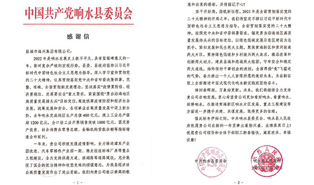海興集團(tuán)收到響水縣委縣政府感謝信