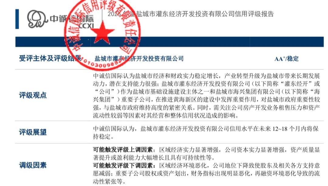 12月31日,集團(tuán)子公司鹽城市灌東經(jīng)濟(jì)開發(fā)有限公司獲得國(guó)內(nèi)權(quán)威信用評(píng)級(jí)機(jī)構(gòu)—中誠(chéng)信國(guó)際授予的AA+主體信用評(píng)級(jí),評(píng)級(jí)展望為“穩(wěn)定”。2026-01-01 -