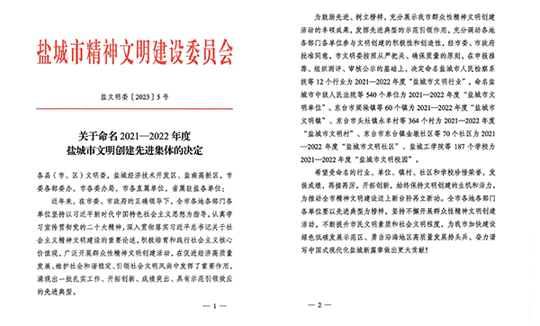 喜報!海興集團(tuán)榮獲“鹽城市文明單位”稱號