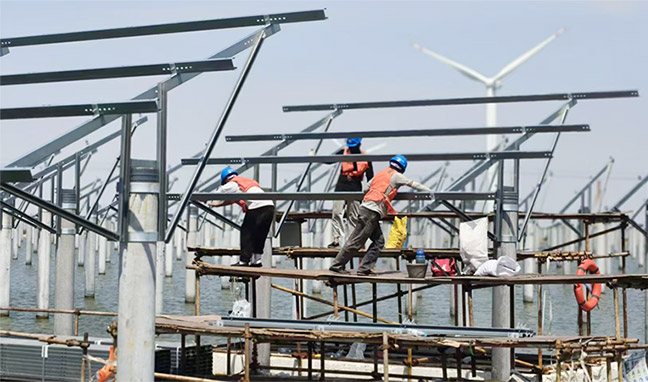 黃海新區(qū)響水片區(qū),6萬(wàn)余根管樁如鋼鐵森林般矗立在碧波之中。興悅新能源420MW漁光互補(bǔ)發(fā)電項(xiàng)目現(xiàn)場(chǎng)呈現(xiàn)一片繁忙有序的景象,頭戴安全帽、身著工作服的工人們,如同靈動(dòng)的音符,穿梭在一根根排列密集的工程樁之間,全神貫注地進(jìn)行著光伏支架和組件的安裝。2025-09-17